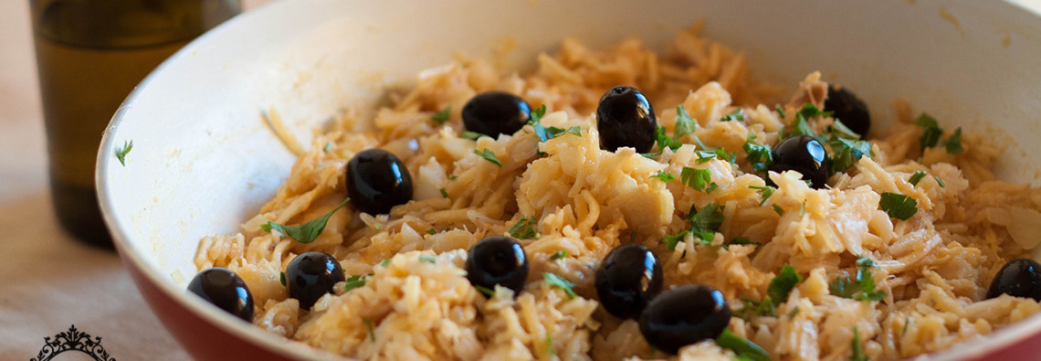 INGREDIENTES 500g bacalhau demolhado 0,5 dl leite 30g margarina 1 dente d’alho 1 cebola 50g chouriço 320g batata palha 4 ovos sal e pimenta q.b. salsa e azeitonas a gosto. Preço médio: €8.57 para 4 pessoas Comece por desfiar o bacalhau, removendo as peles…